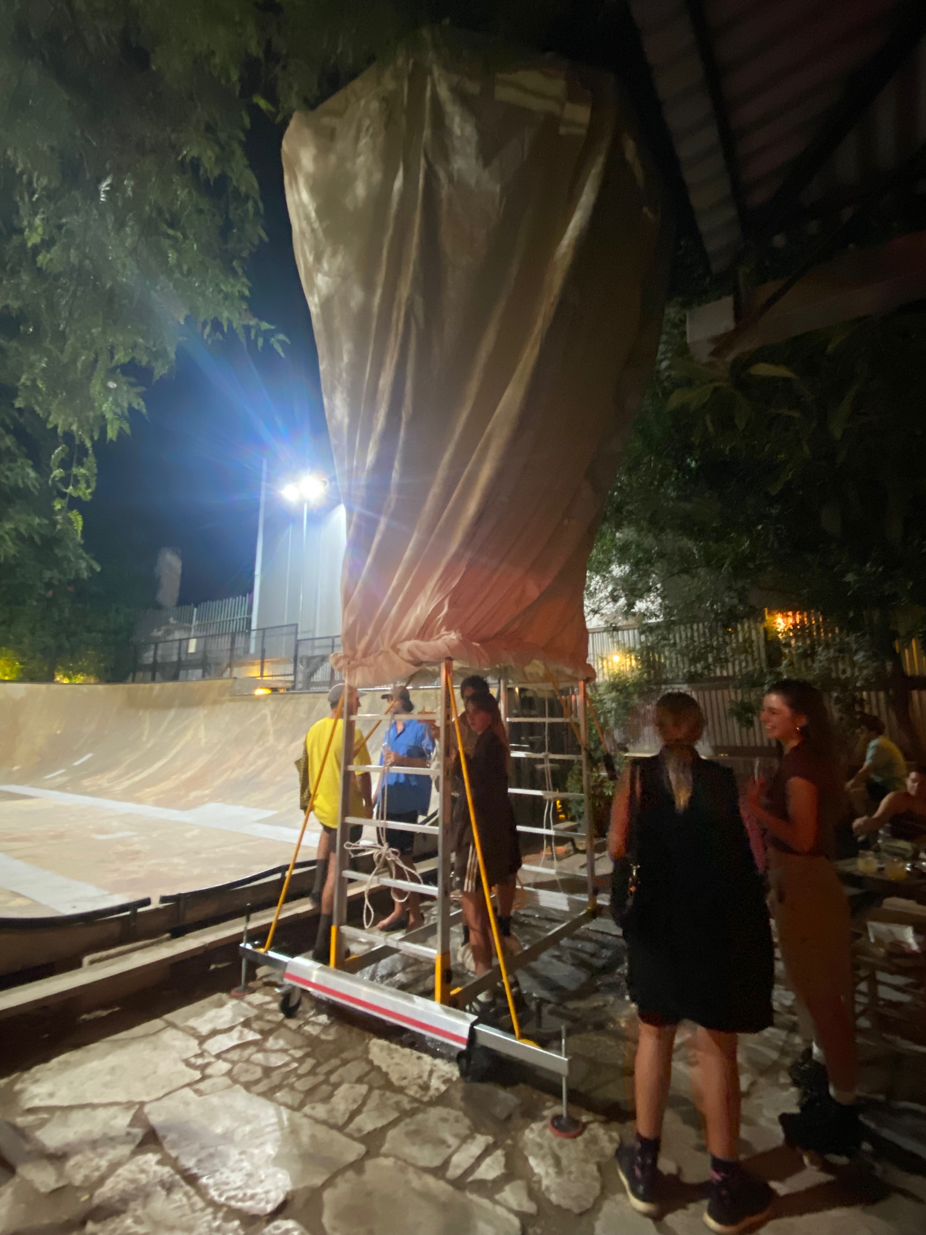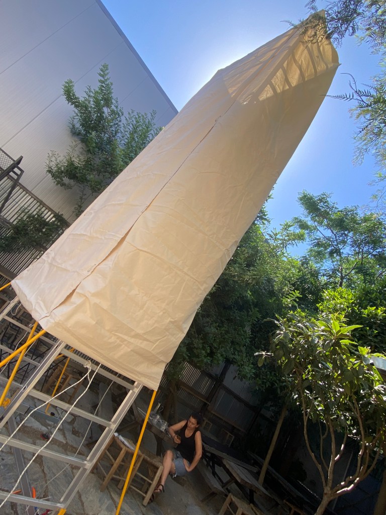 By re-imagining ancient and vernacular natural cooling techniques from cultures around the planet, as well as more recent research, in the summer 2024 we tested a series of temporary seven meter high fabric evaporative cooling structures at the Latraac urban garden in Athens, producing 10 degree Celcius temperature drops (from 35C to 25C) within 15 min using zero electricity.